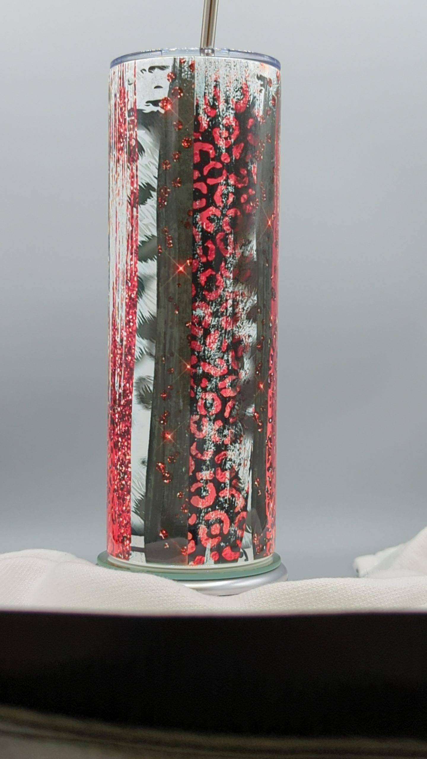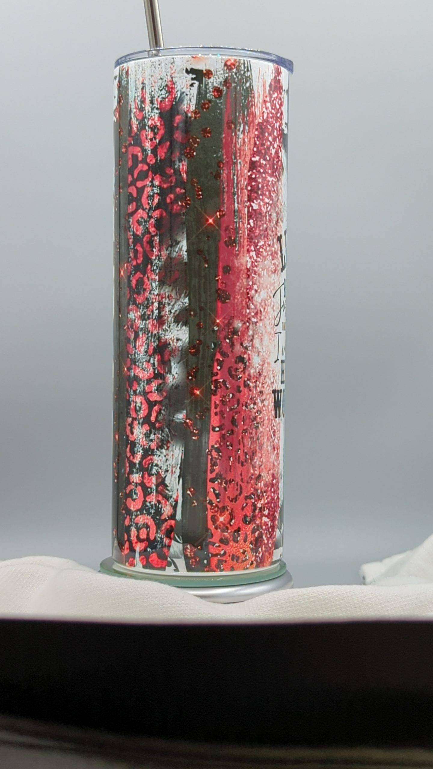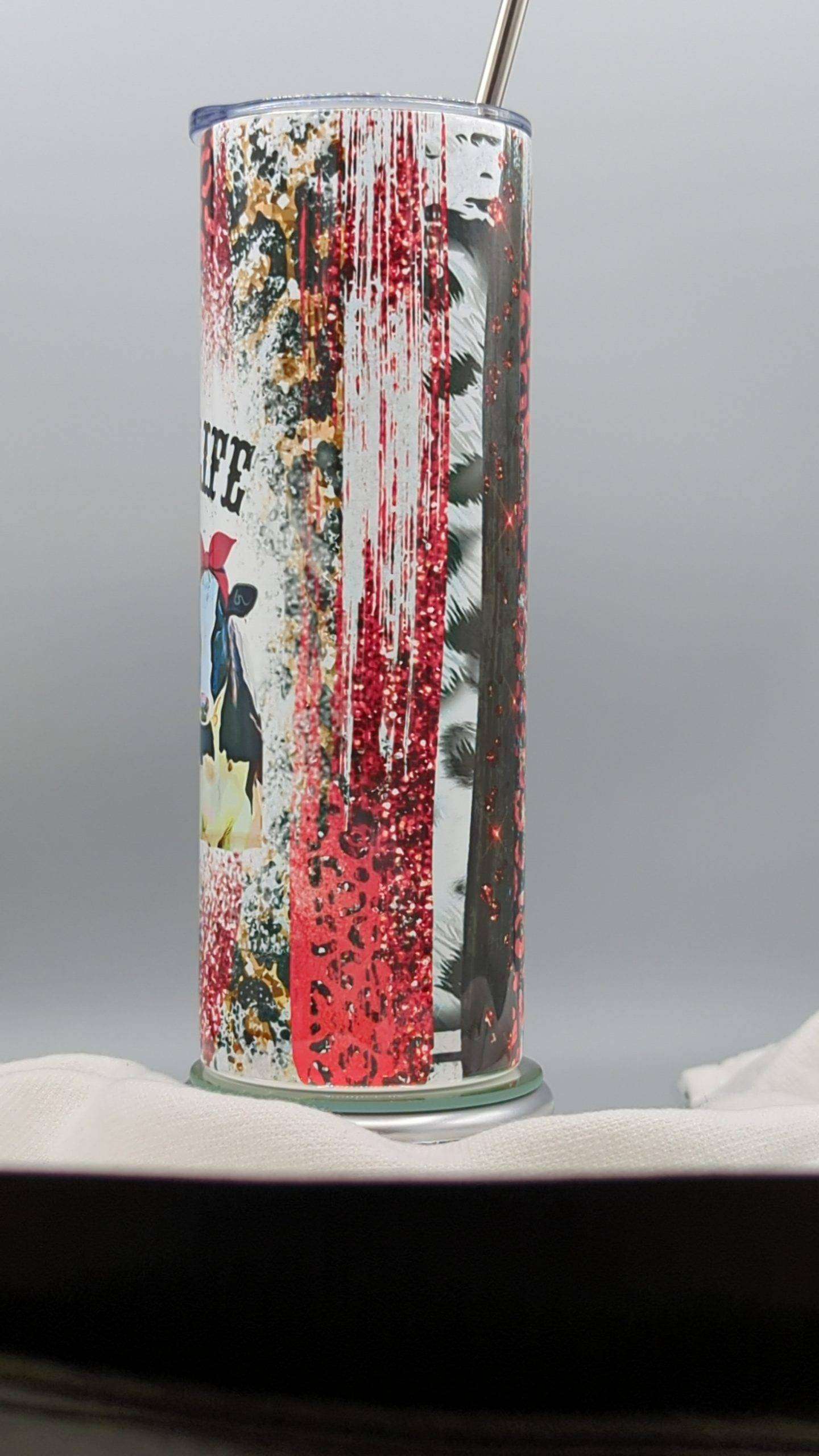 - 20oz Skinny Stainless Steel Tumbler, with clear lid and metal or plastic straw.