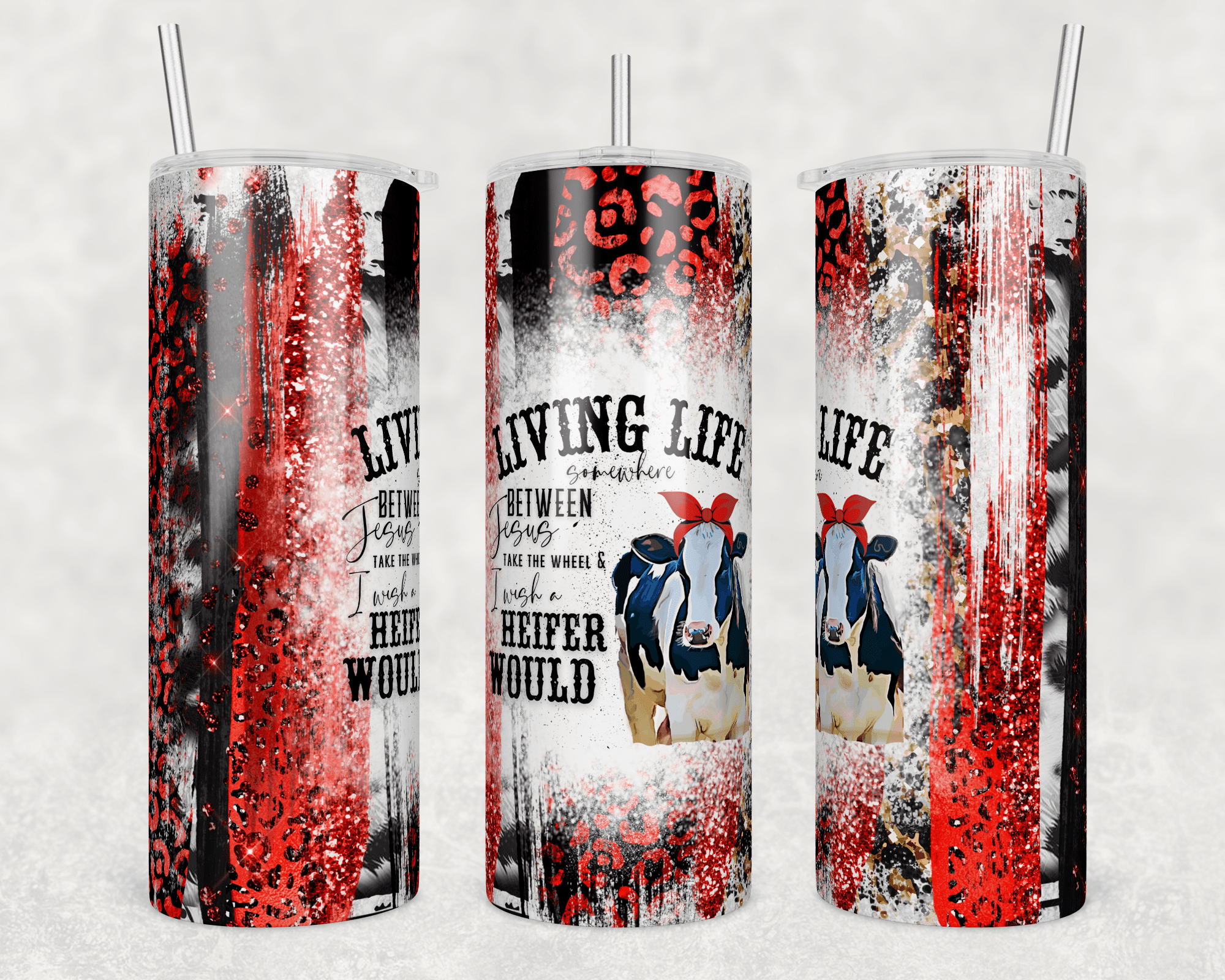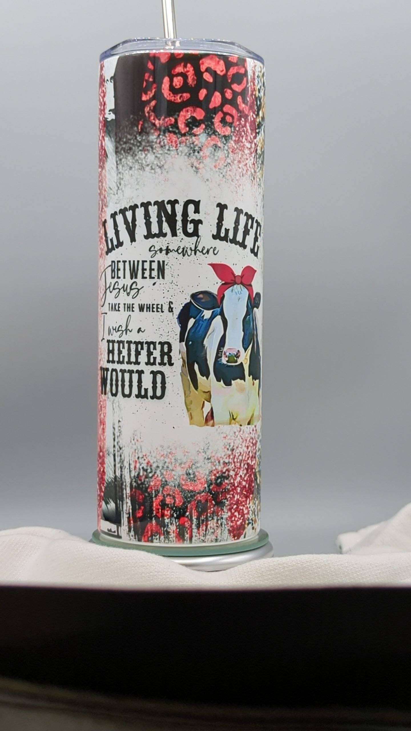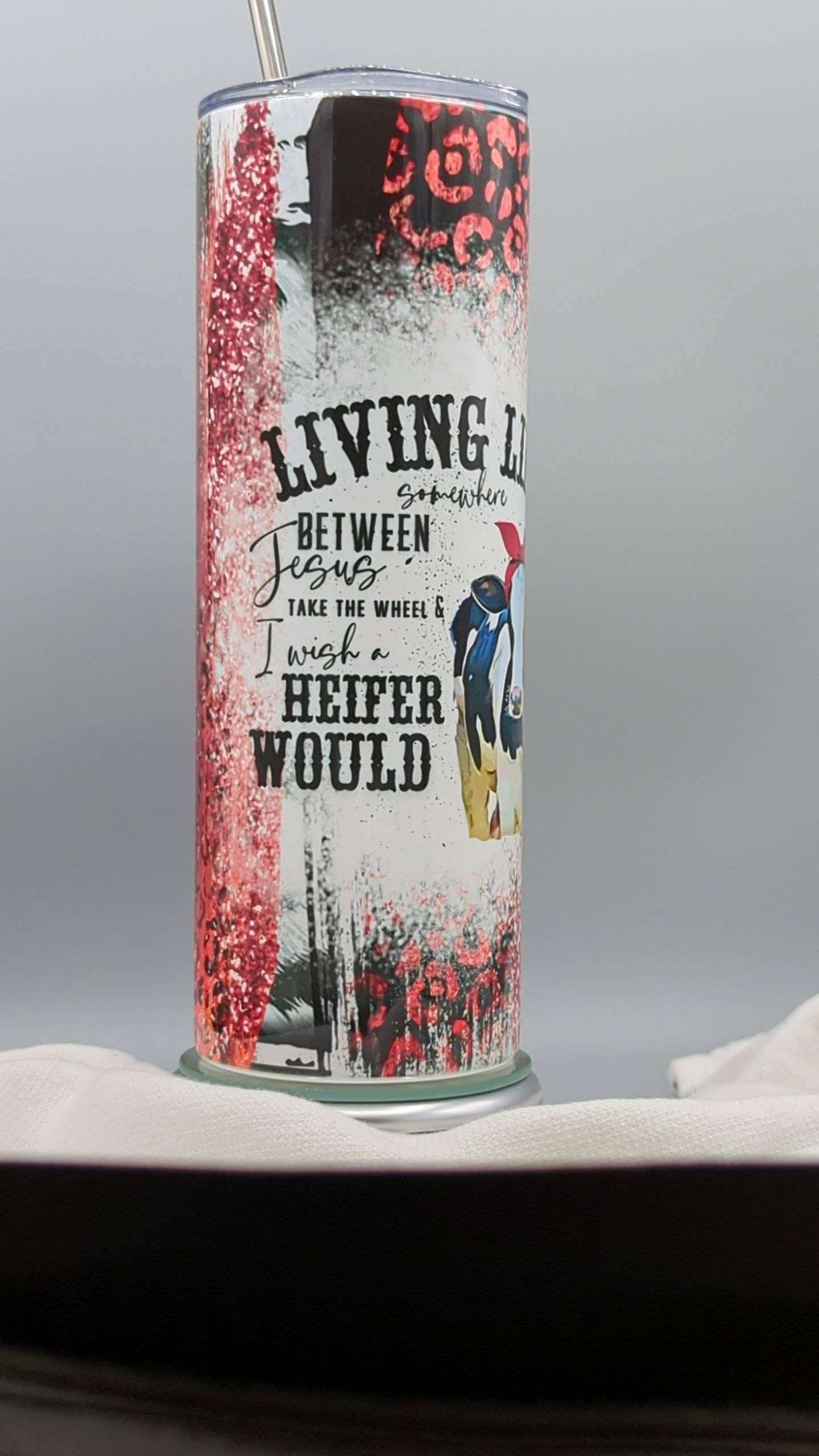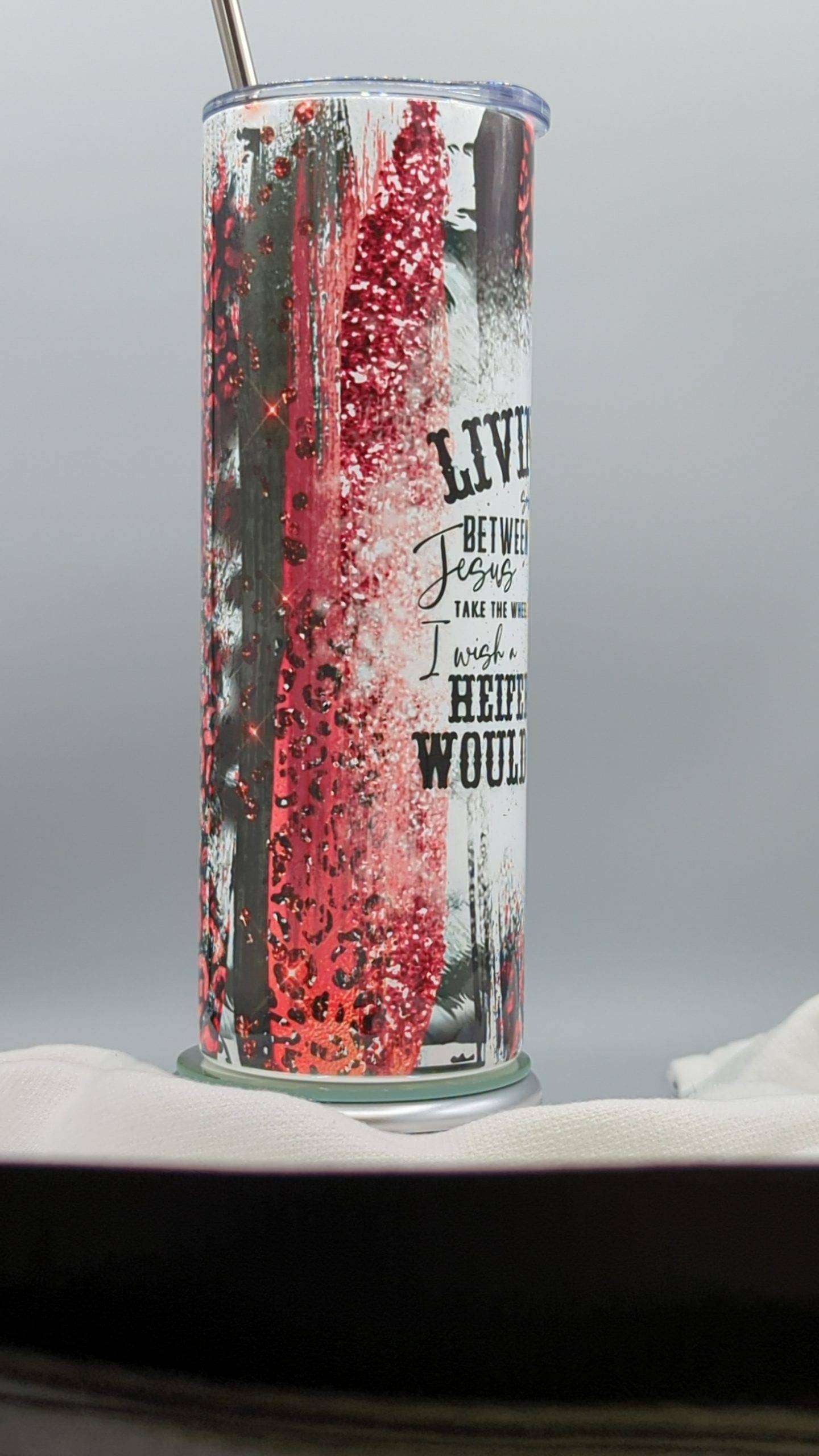 - 20oz Skinny Stainless Steel Tumbler, with clear lid and metal or plastic straw.