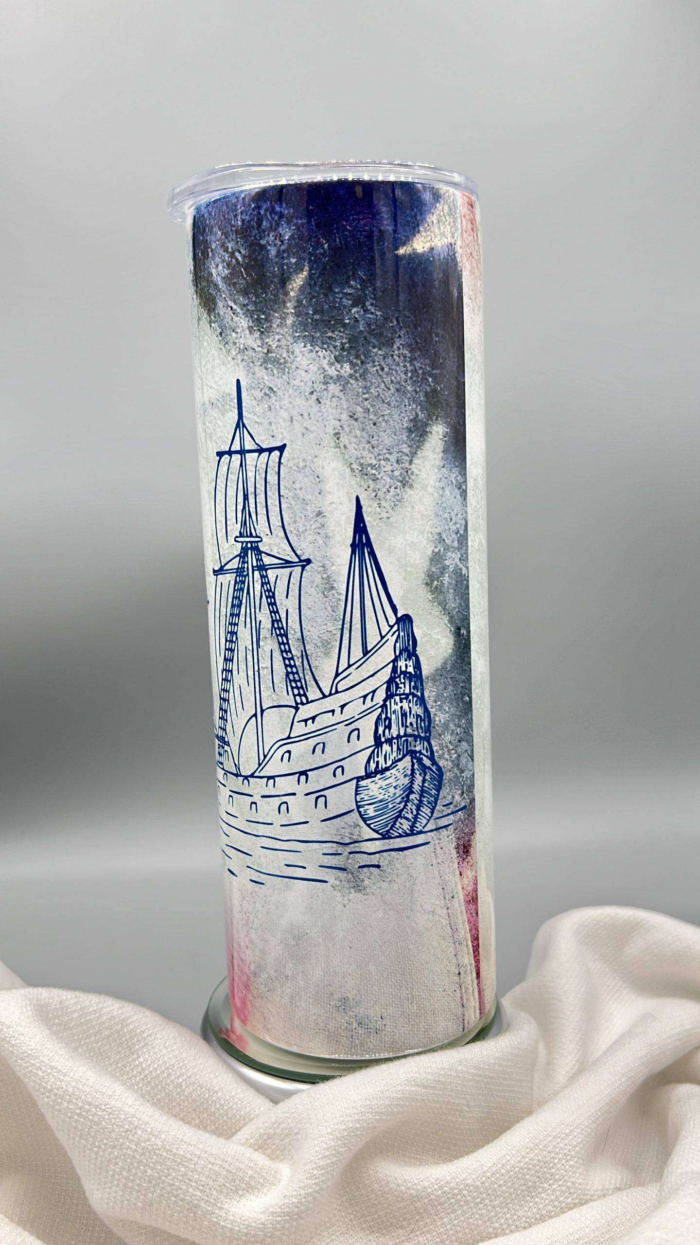 - 20oz Skinny Stainless Steel Tumbler, with clear lid and metal or plastic straw.